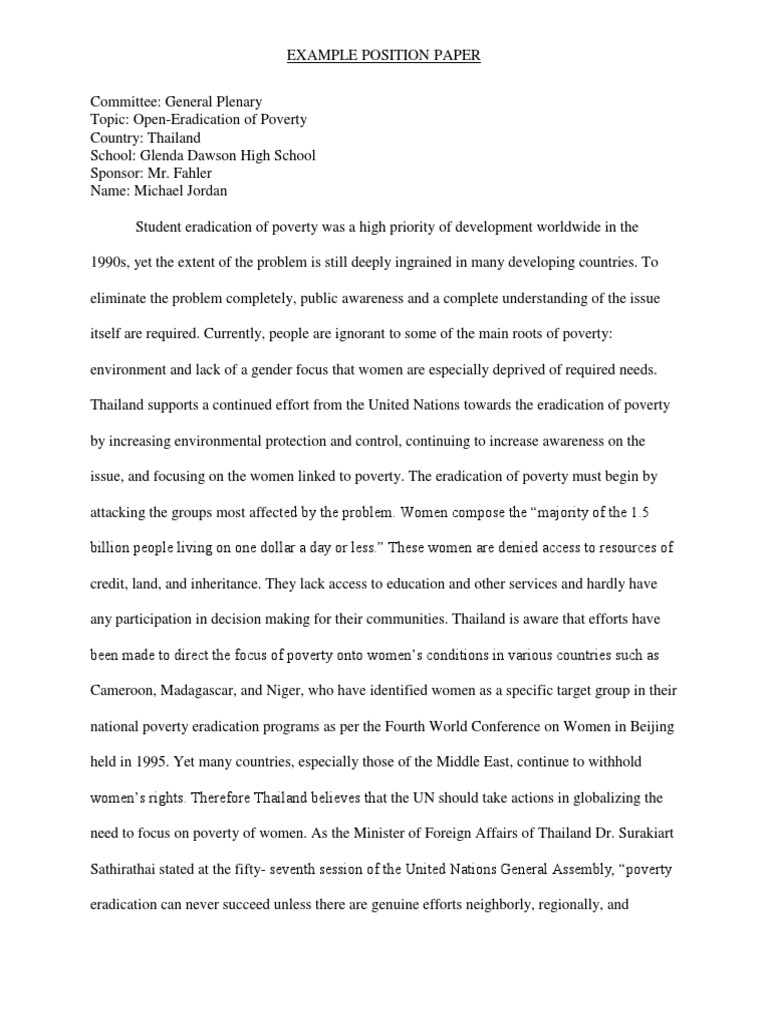 The room was the same, the machine was the same, the technician was the same, but somehow everything felt different. Below is another example of a position paper that you could use as a reference. An effective position paper can be broken into five simple parts: The complexity of the work at hand required greater donor support. Read what other delegates wrote to best strategize what course of. It for example develops constructs for defining and even comprehending poverty in the essay. Your position paper centers around a topic that is supported by research. For example, a topic background on the issue of human trafficking might provide the official definition of human this portion of the essay addresses efforts the un has previously made and endeavors your country. This sample poverty research paper is published for educational and informational purposes only. Poverty eradication is the number one need. For example, if a nation such as. This essay has been submitted by a student. Position essay examples to help you grasp the idea.